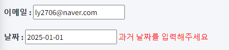 이메일은 형식에 맞게 작성되었고, 날짜는 과거 날짜만 입력할 수 있기 때문에 등록버튼을 누르면 날짜만 오류 메세지를 띄워주는 것을 볼 수 있다.
