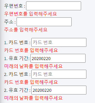 1. 유효 기간: <form:input path="cardList[0].validMonth" placeholder="유효 기간" /><br />