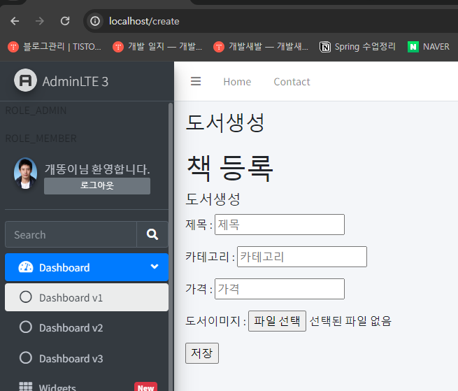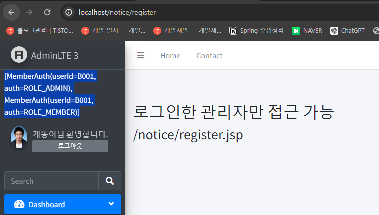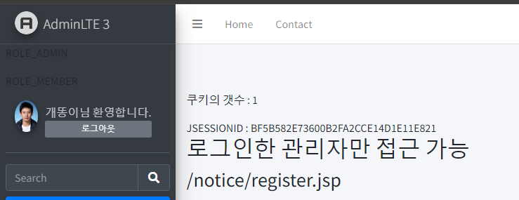 이제 notice / register에 접속해 로그인을 해보자(Admin 권한이 있는 걸로)