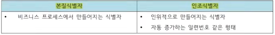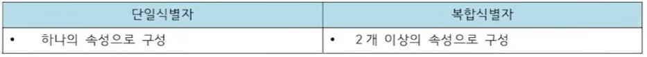- ex) 이름은 동명이인이 있을 수 있으므로 사번, 학번 등이 고유 식별자