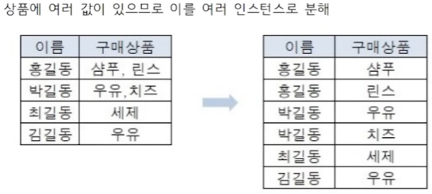 - 테이블의 컬럼이 원자성(한 속성이 하나의 값을 갖는 특성)을 갖도록 테이블을 분해하는 단계