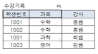 - 수강 이력에서는 한 학생이 여러 강의를 수강할 수 있기 때문에 주 식별자는 학생번호로만은 불가능(유일성 불만족 때문). 따라서 학생 번호와 강의명이 결합되어 주식별자가 되어야 한다.(한 학생이 같은 강의는 수강할 수 없다고 가정)