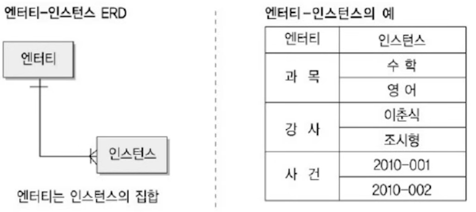 - 엔티티는 업무상 분석해야 하는 대상(Instance)들로 이루어진 집합