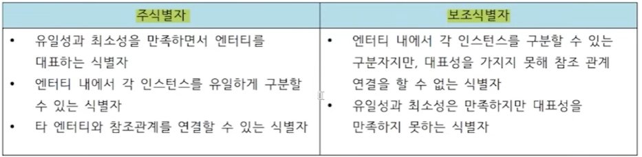 ex) 학생번호와 주민번호 중 학생번호가 주식별자, 주민번호는 보조식별자