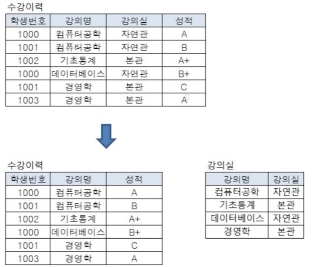 - 기본키(학생 번호 + 강의명)중, 강의명에 의해 강의실이 변경 -> 완전 함수 종속성 위배(부분 함수 종속성을 가짐) -> PK와 부분 함수 종속성을 갖는 컬럼을 각각 다른 테이블로 분해