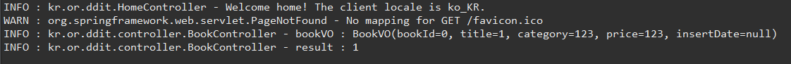 <!-- bookVO(후)=>{"bookId":1,"title":"총알탄 개똥이","category":"소설","price":10000,"insertDate":""} -->