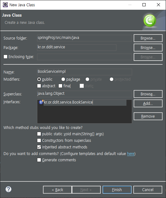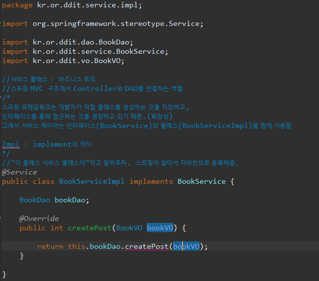 BookServiceImpl에도 같은 이름으로 오버라이딩 된다.(@Service 어노테이션은 스프링이 자바빈으로 등록하기 위한 역할이기때문에 필수적이다.)